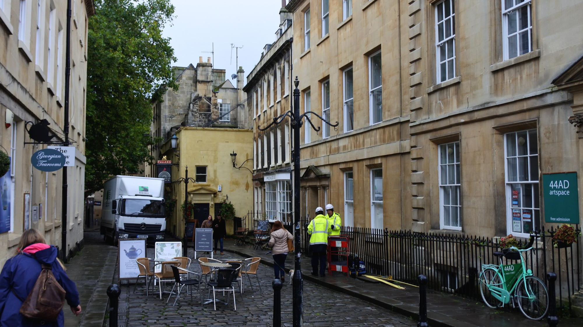 ▲ 킹스톤 퍼레이드 광장 남쪽의 애비 스트리트의 모습입니다. 길바닥은 돌이 깔려 있고 Georgian Tearooms라는 찻집과 44AD artspace라는 아티스트 스튜디오가 있습니다. 찻집의 테이블과 의자가 나와 있습니다.