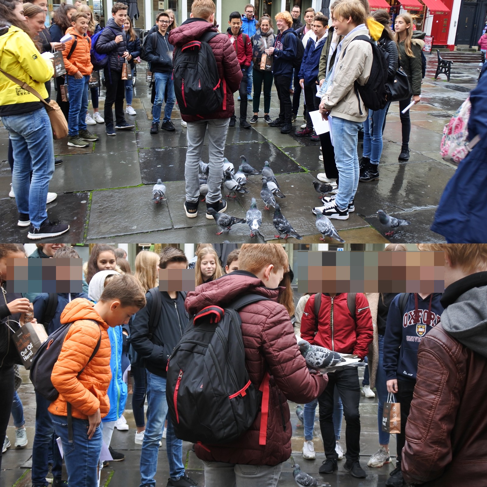 ▲ 로만 바스 관람을 마친 학생들이 모여 있습니다. 비둘기들이 학생들과 친해보입니다.