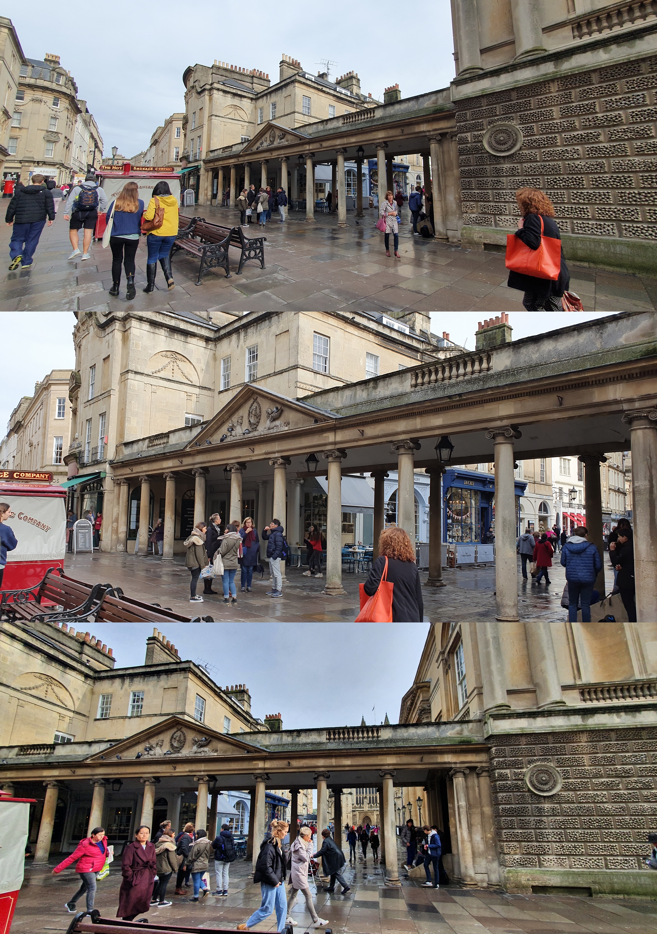 ▲ 왕과 왕비의 목욕탕 건너편에 있는 바스 스트리트에는 1층에 열주가 있는 건물들이 있습니다. 이 건물들의 1층에는 상점들이 있습니다. 위에는 아파트들이 있는데 일부는 임대가 가능합니다. 도로 끝에 보이는 오래된 건물은 크로스 바스(The Cross Bath)라는 오래된 야외 온천이 있습니다. 또한 도로 남쪽에는 써미 바스 스파(Thermae Bath Spa)라는 현대식 온천시설이 있습니다.