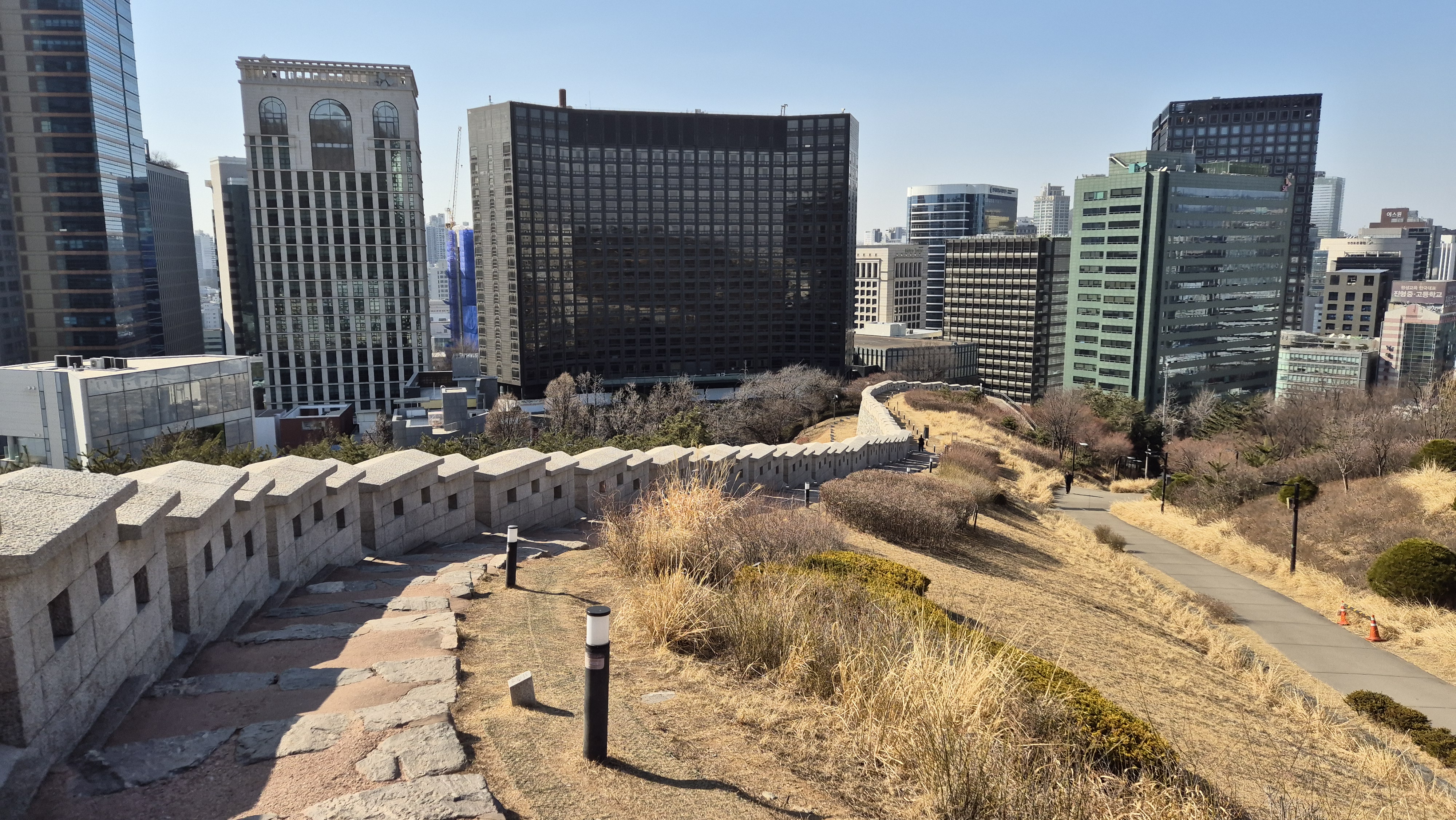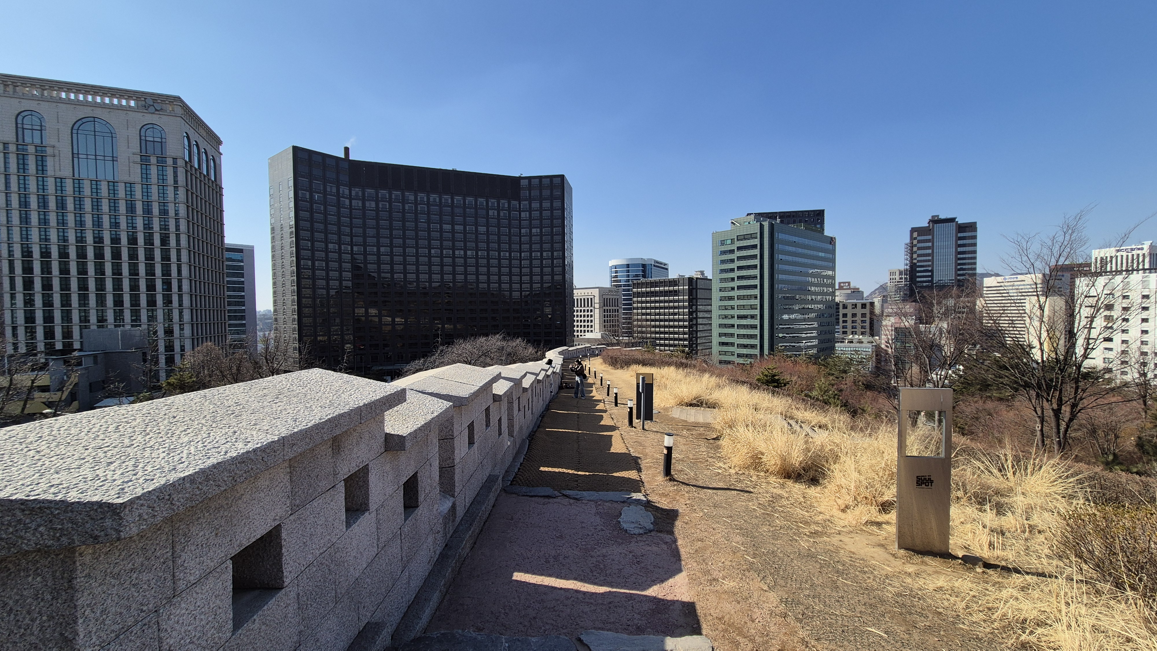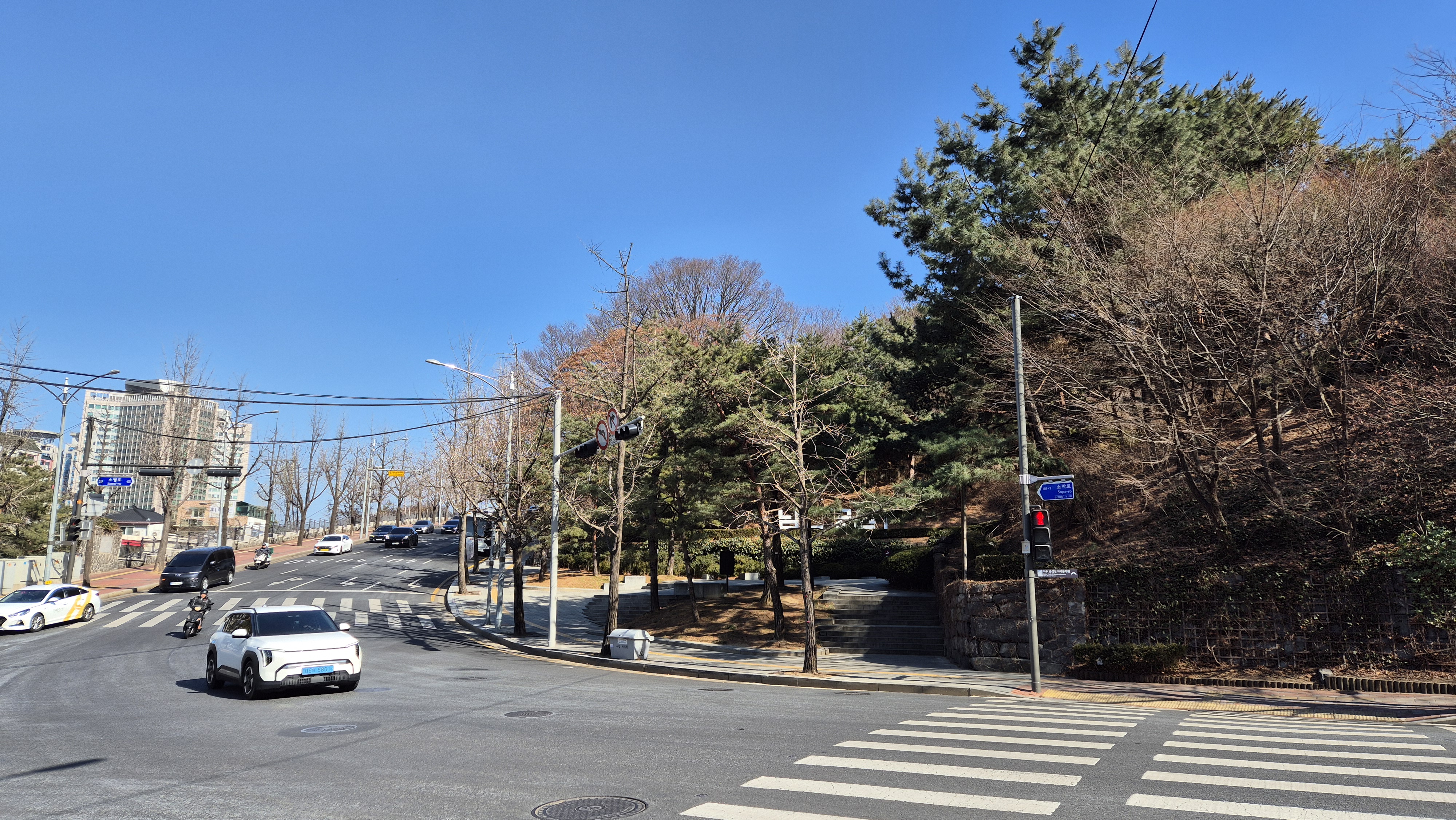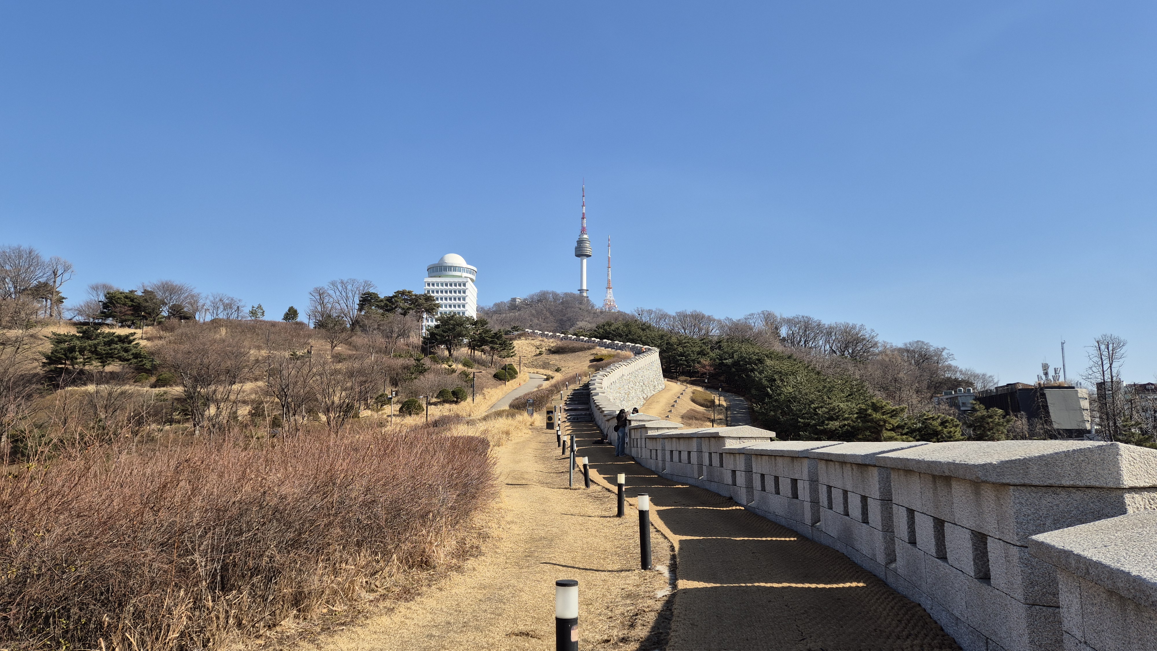 ▲ 호텔 앞 소월로의 건널목을 건너 남산공원으로 이동합니다. 남산 공원 내 서울 한양도성 옆 계단에서 보면 호텔의 모습을 더 자세히 볼 수 있습니다.