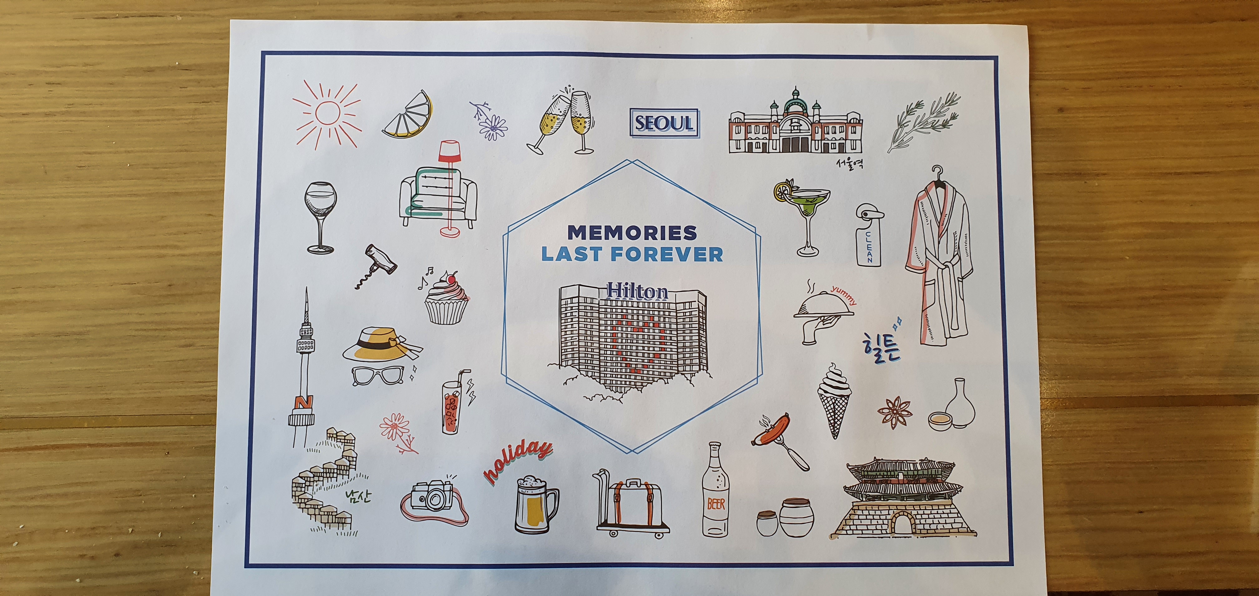 ▲ 폐관을 앞둔 2022년 12월 마지막 주 밀레니엄 힐튼 서울 호텔의 '카페 395'의 식탁 위에 준비된 페이퍼 테이블 매트입니다. 'Memories Last Forever (추억은 영원하다)'라는 문구와 함께 하트 모양이 표현된 힐튼호텔, 남산 서울타워와 한양 도성 성벽, 그리고 서울역과 남대문, 호텔의 어메니티 등이 그려져 있었습니다. 그동안 호텔을 이용해 준 고객들에게 작별을 고하는 엽서 같은 느낌이 들었습니다.