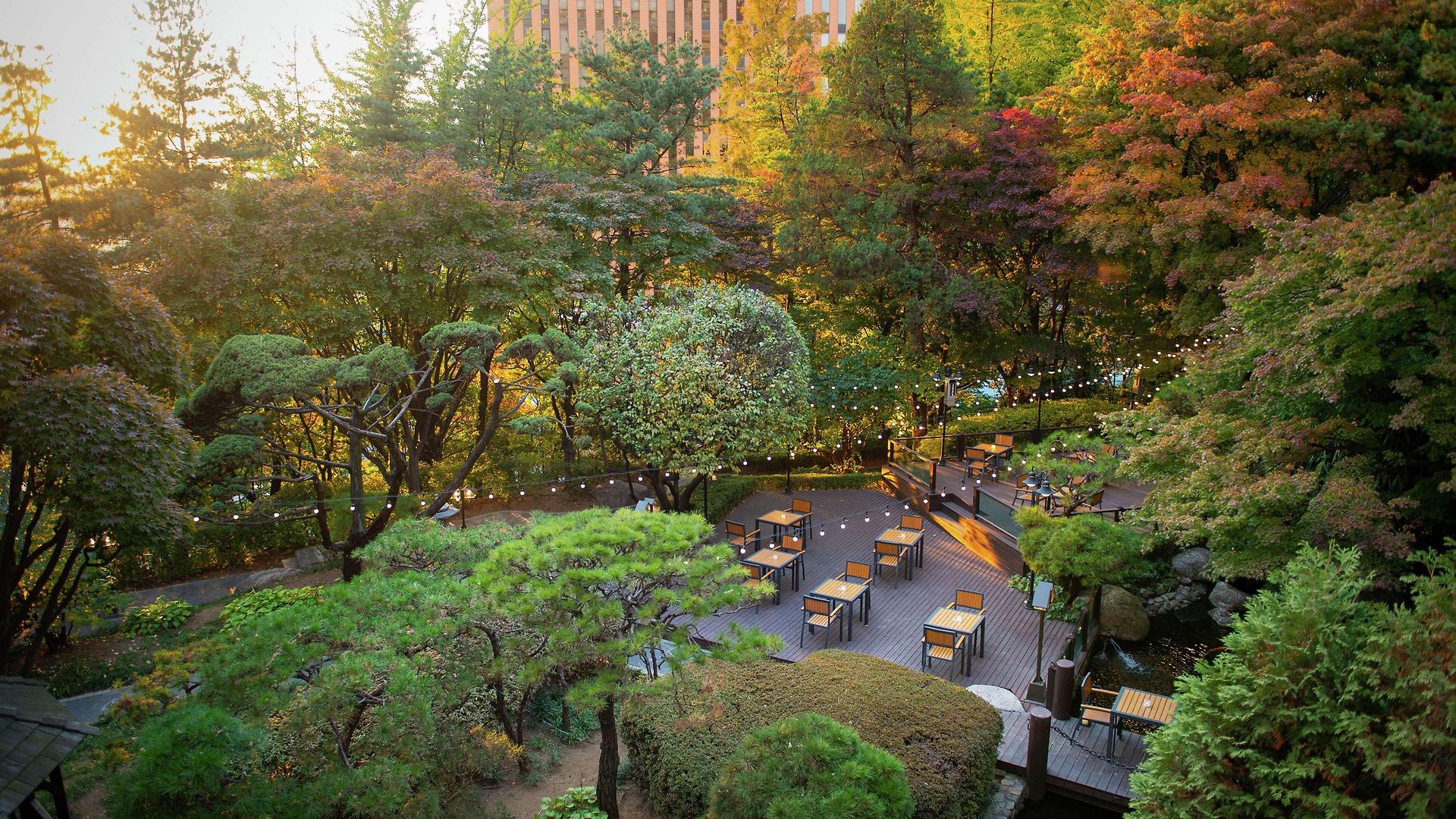 ▲ 가을에 단풍이 들면 더욱더 멋있어지는 정원이었습니다. 호텔의 로어 로비에 있던 주점 오크룸과 일식당 구상노사카바, 메인 로비의 카페 365에서는 커다란 유리창을 통해 식사나 하거나 맥주를 마시면서 호텔 정원을 감상할 수 있었습니다.