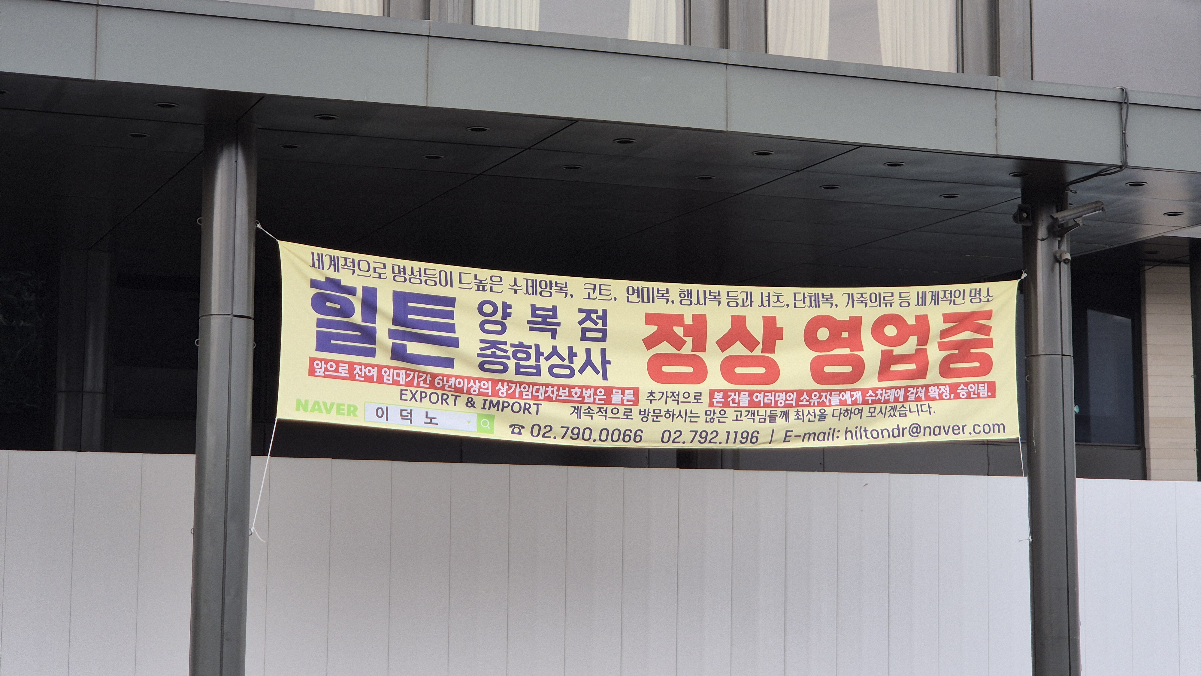 ▲ 호텔 2층에 힐튼양복점이 아직도 운영을 하고 있습니다. 호텔을 인수한 이지스자산운용은 힐튼양복점이 운영되는 동안 힐튼호텔 상시 개방은 물론 냉난방 가동, 경비 인력 고용·운용 등을 지속하고 있다고 합니다.