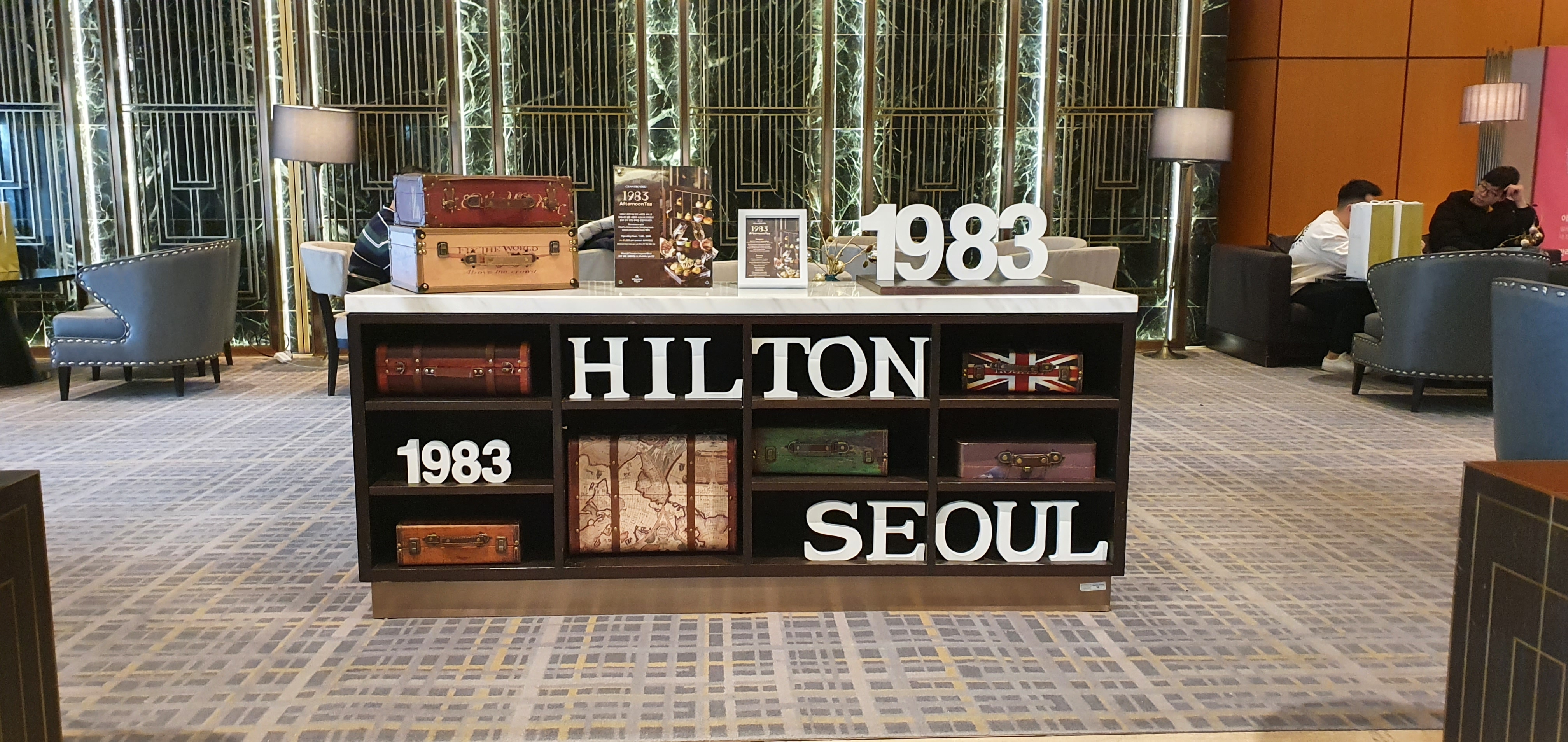 ▲ 2022년 폐관 직전에 호텔 로비에 전시되어 있던 오래된 여행 가방들과 호텔이 개관한 해인 1983이라는 숫자와 힐튼이라는 이름이 있는 작은 책장입니다. 호텔의 40년간의 역사를 보여주는 전시물이었습니다.