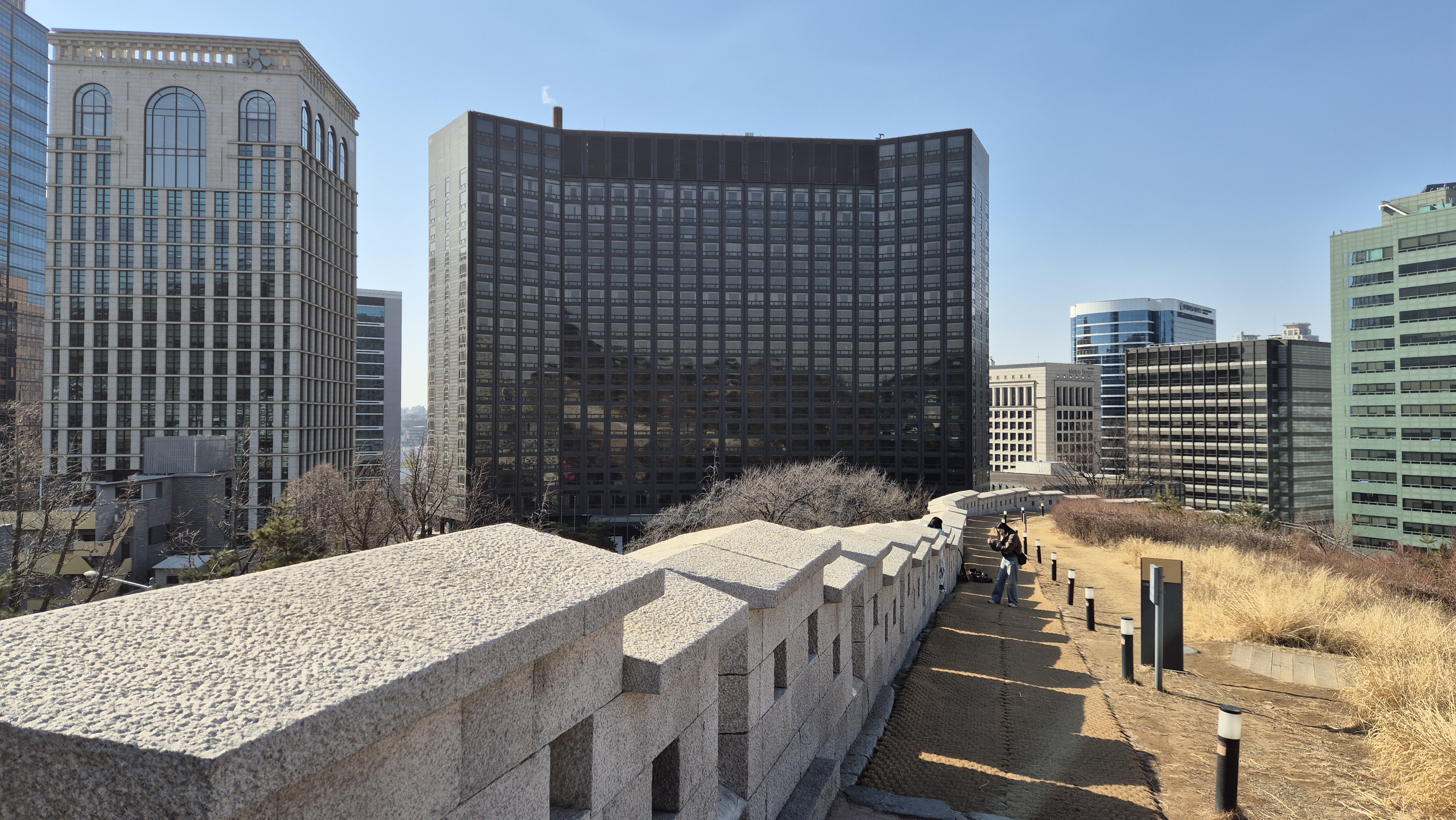 ▲ 남산 공원 한양 성곽 옆 길에서 바라보이는 밀레니엄 힐튼 서울 호텔 (Millennium Hilton Seoul Hotel)의 모습입니다.
