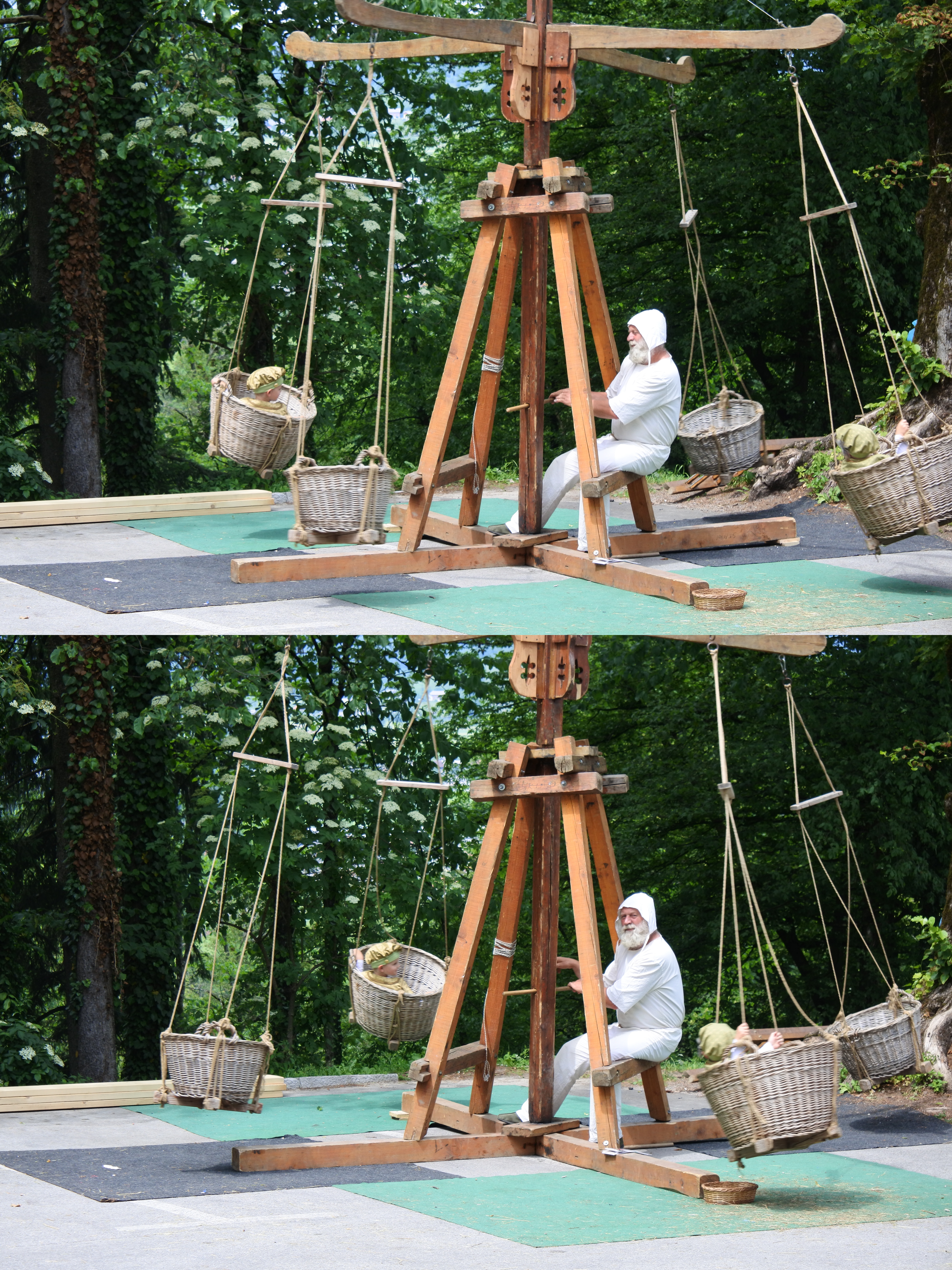 ▲ 전통 나무 회전 바구니 (Fairground Ride)입니다. 어린이용 수동 회전 놀이기구로 바구니처럼 생긴 나무 구조물에 아이들이 앉고, 중심축을 돌려 회전합니다. 유럽 시골 지역 전통 축제나 슬로베니아 목공 전통 놀이에서 볼 수 있습니다. 바구니에 있는 중세 시대 복장의 아이들은 인형입니다.