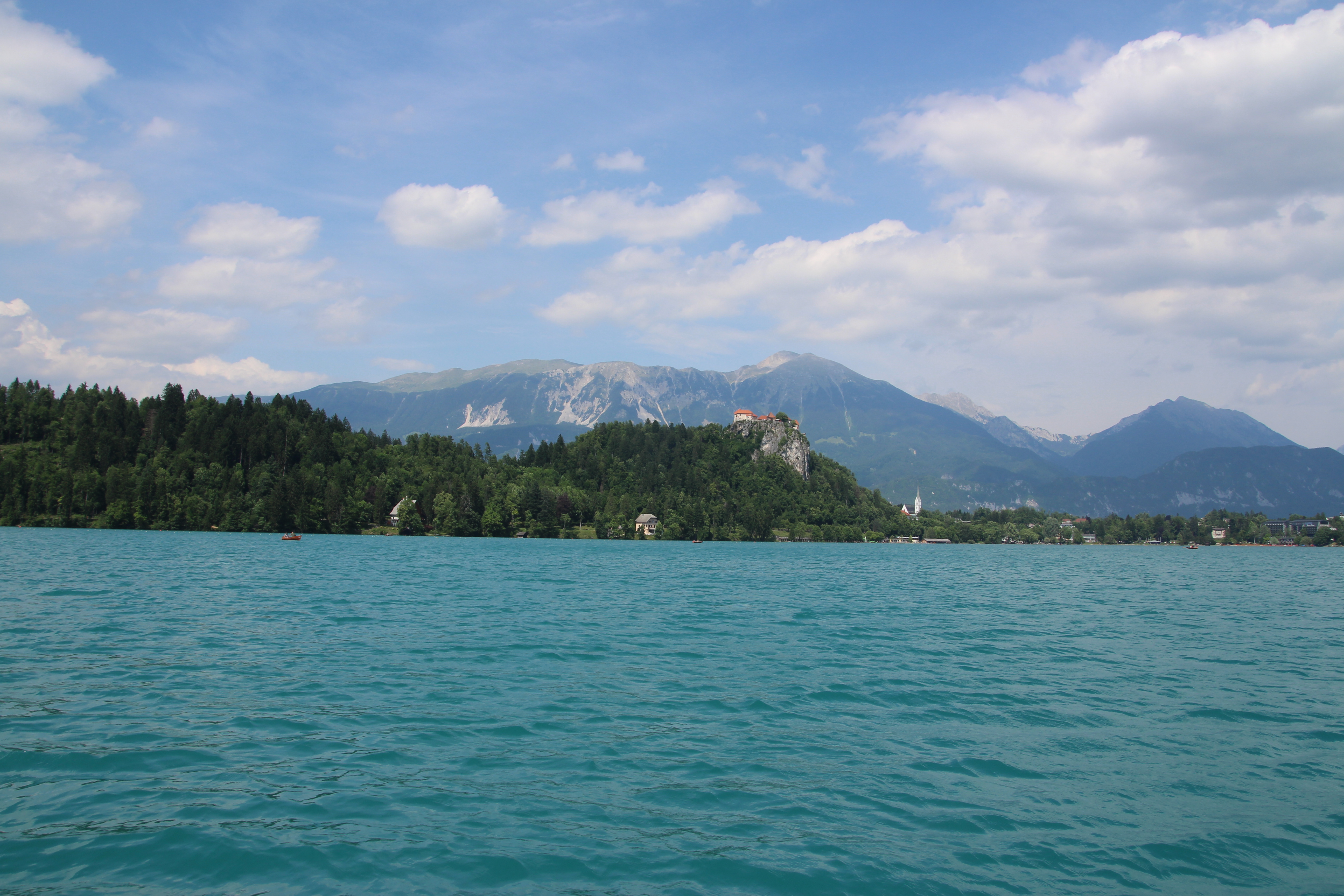 ▲ 블레드 호수는 슬로베니아의 알프스 지역의 남쪽에 위치해 있으며, 알프스의 북쪽 기슭에 자리잡고 있습니다. 블레드 호수 위의 플레트나 뒤로 블레드성과 알프스 산맥이 보입니다.