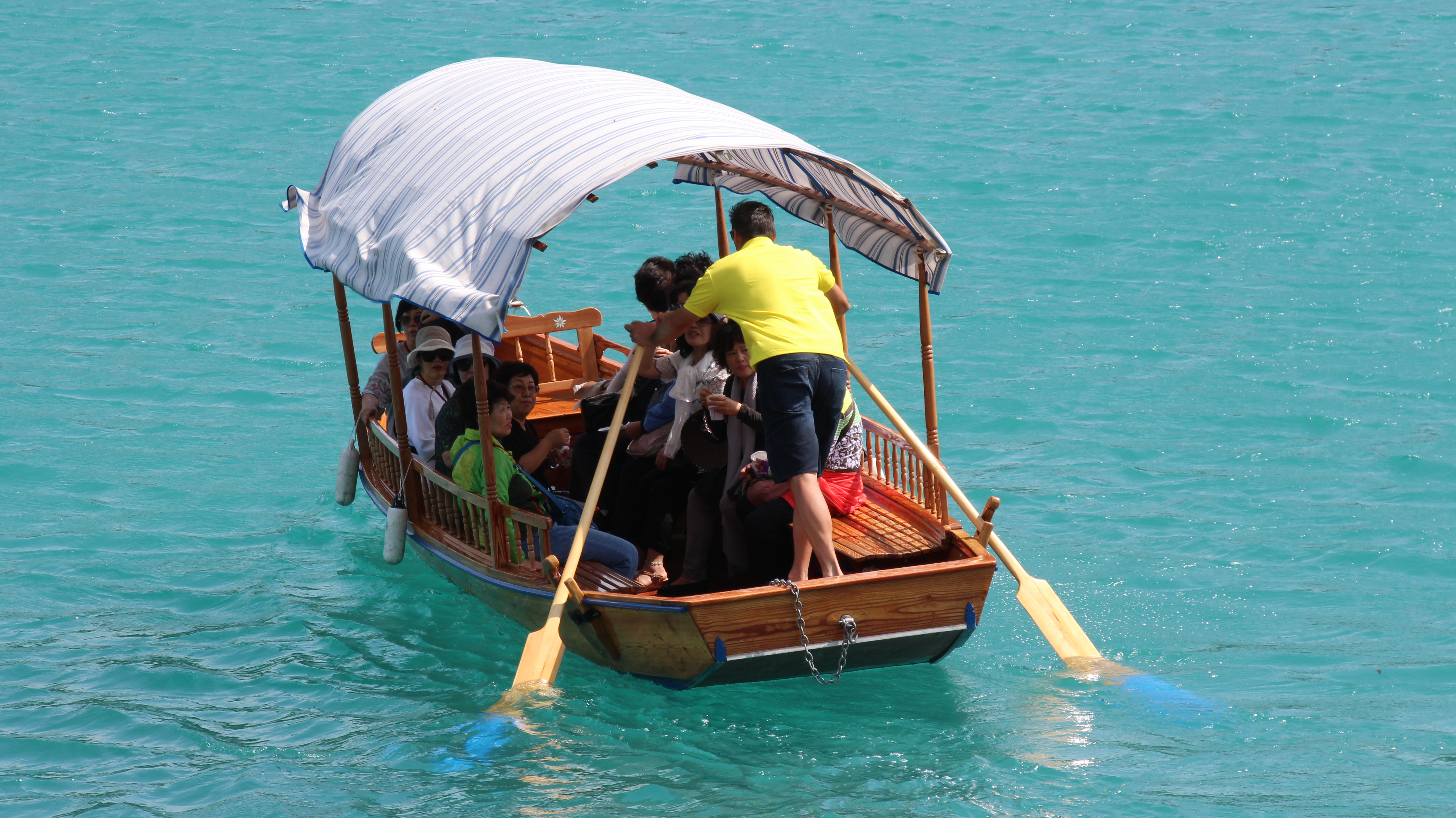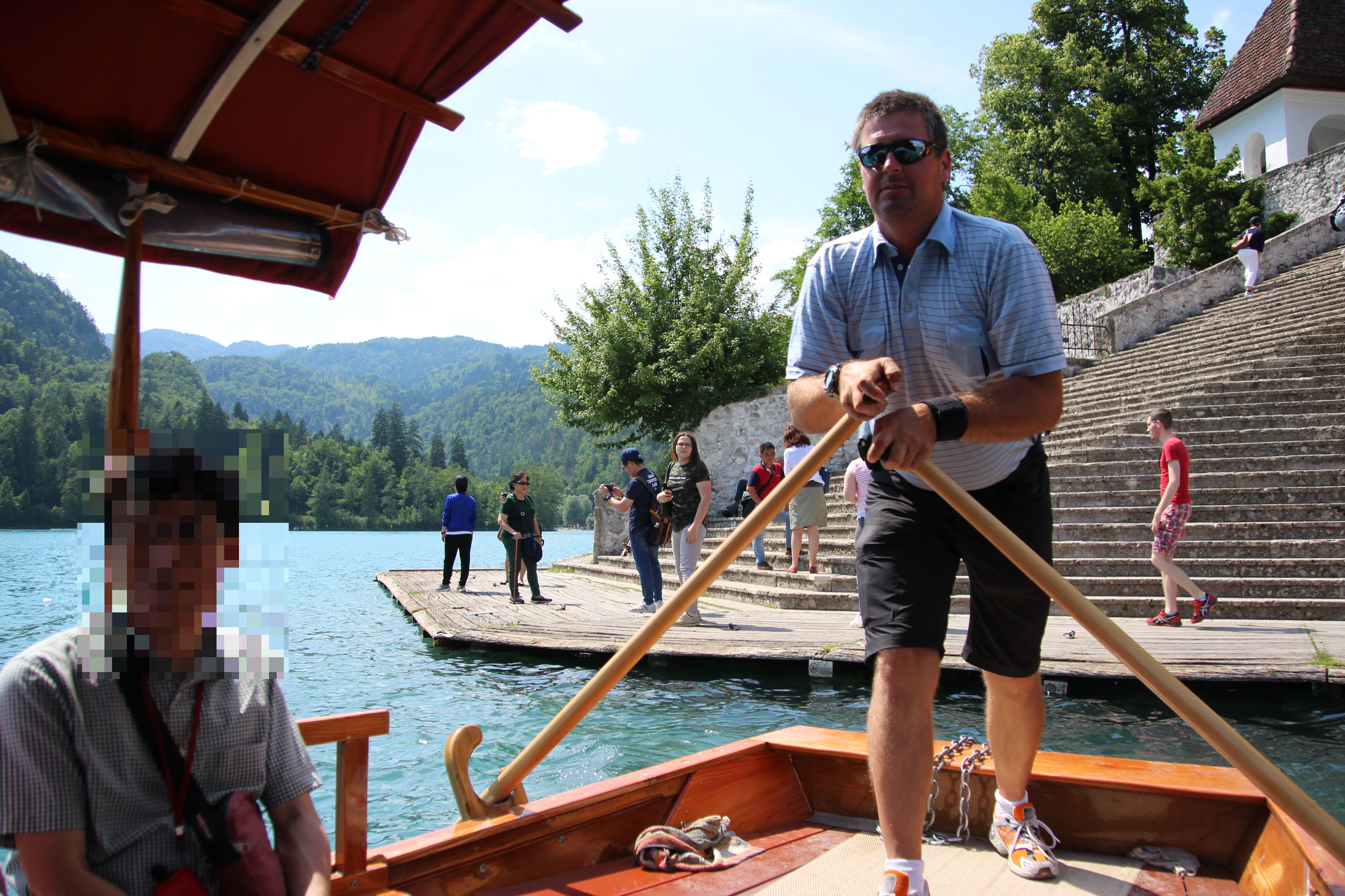 ▲ 플레트나 보트 뒤로 블레드 섬의 성모승천 교회(Pilgrimage Church of the Assumption of Maria)의 종탑이 보입니다. 플레트나 보트는 슬로베니아어로 "널빤지"를 뜻하는 pletati에서 이름이 유래했는데 엔진 없이 선장이 노를 젓는 방식을 사용합니다. 블레드 호수 선착장과 블레드 섬을 왕복하는데 편도 약 15~20분 정도 걸립니다. 플레트나 보트의 선장이 되기 위해선 가문 대대로 내려오는 특권이 필요하며 오늘날에도 대부분 가족 단위로 계승됩니다.