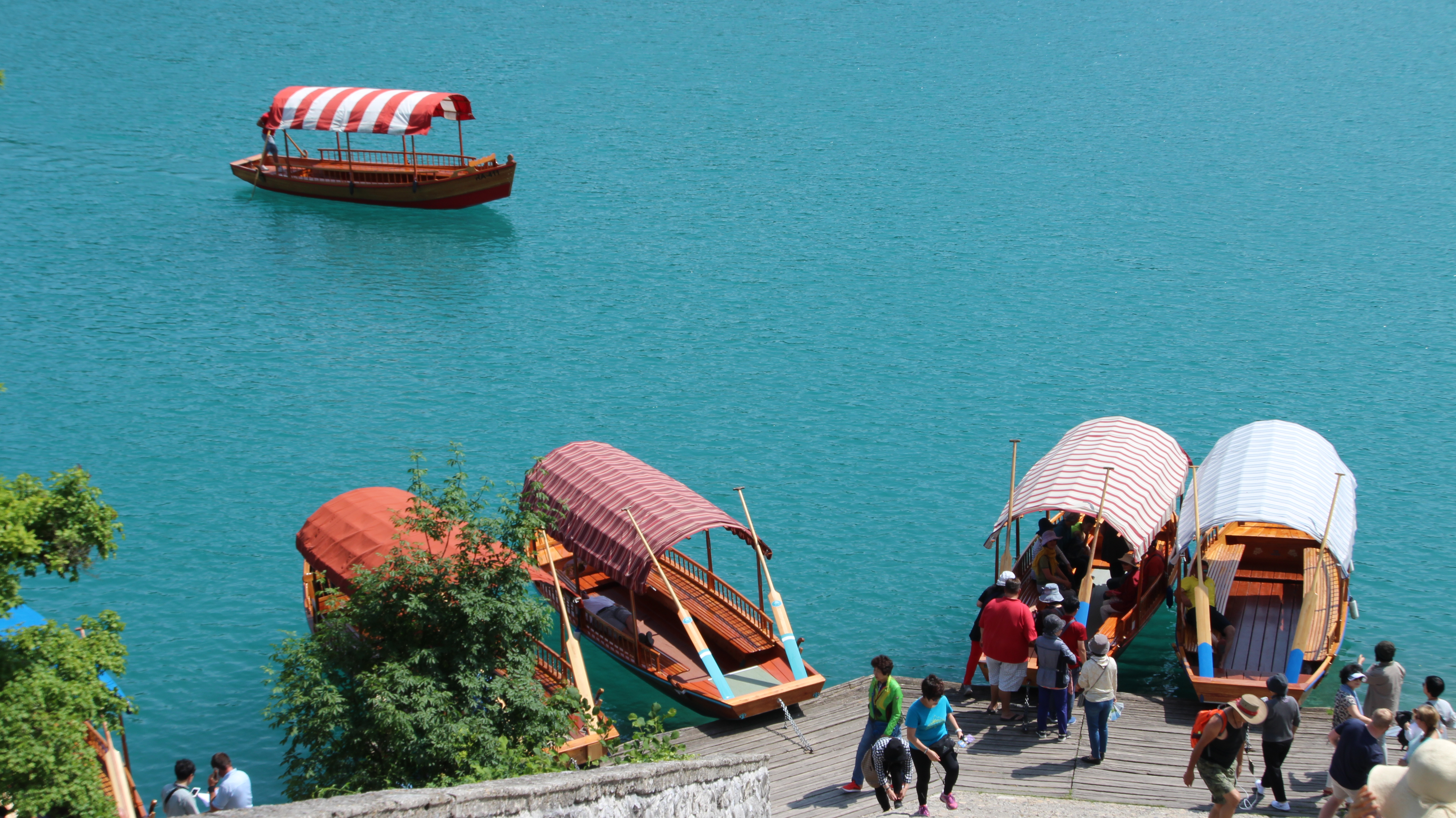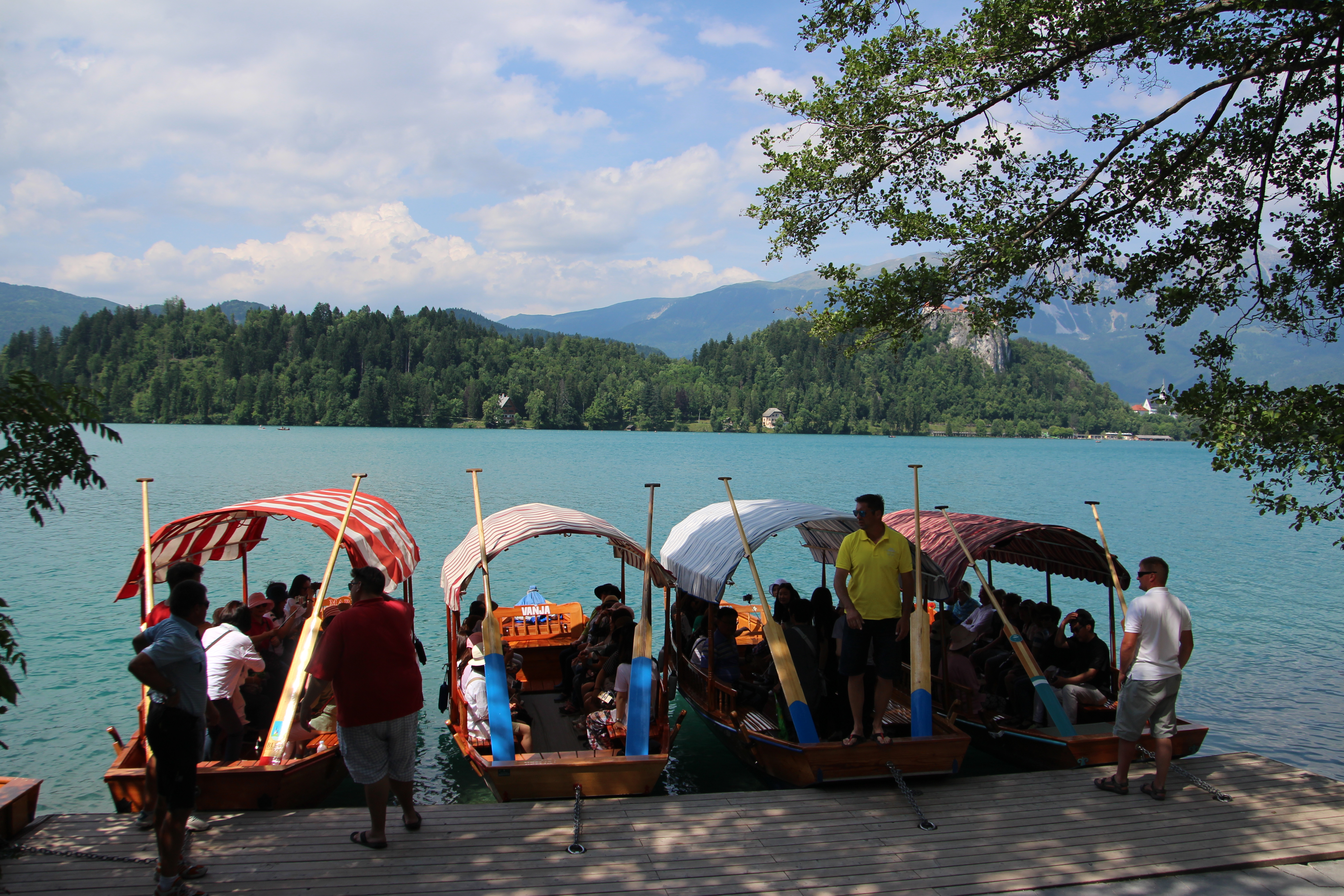 ▲ 블레드 섬 선착장에 방문객을 다시 실어나르기 위해 기다리고 있는 플레트나 보트와 선장들도 보이고 이제 막 방문객들을 태우고 섬으로 들어는 플레트나 보트들도 보입니다. 블레드 호수 선착장에서 블레드 섬까지 거리는 대략 500미터 정도이라고 합니다. 플레트나 보트 선장의 수입은 고정 급여보다는 운행 수와 탑승객 수에 따라 달라지므로 매우 변동적인데 평균 수입은 월간 약 2,500 ~ 4,000 유로 정도이며 관광 시즌의 수입은 이보다 높을 수 있다고 합니다.