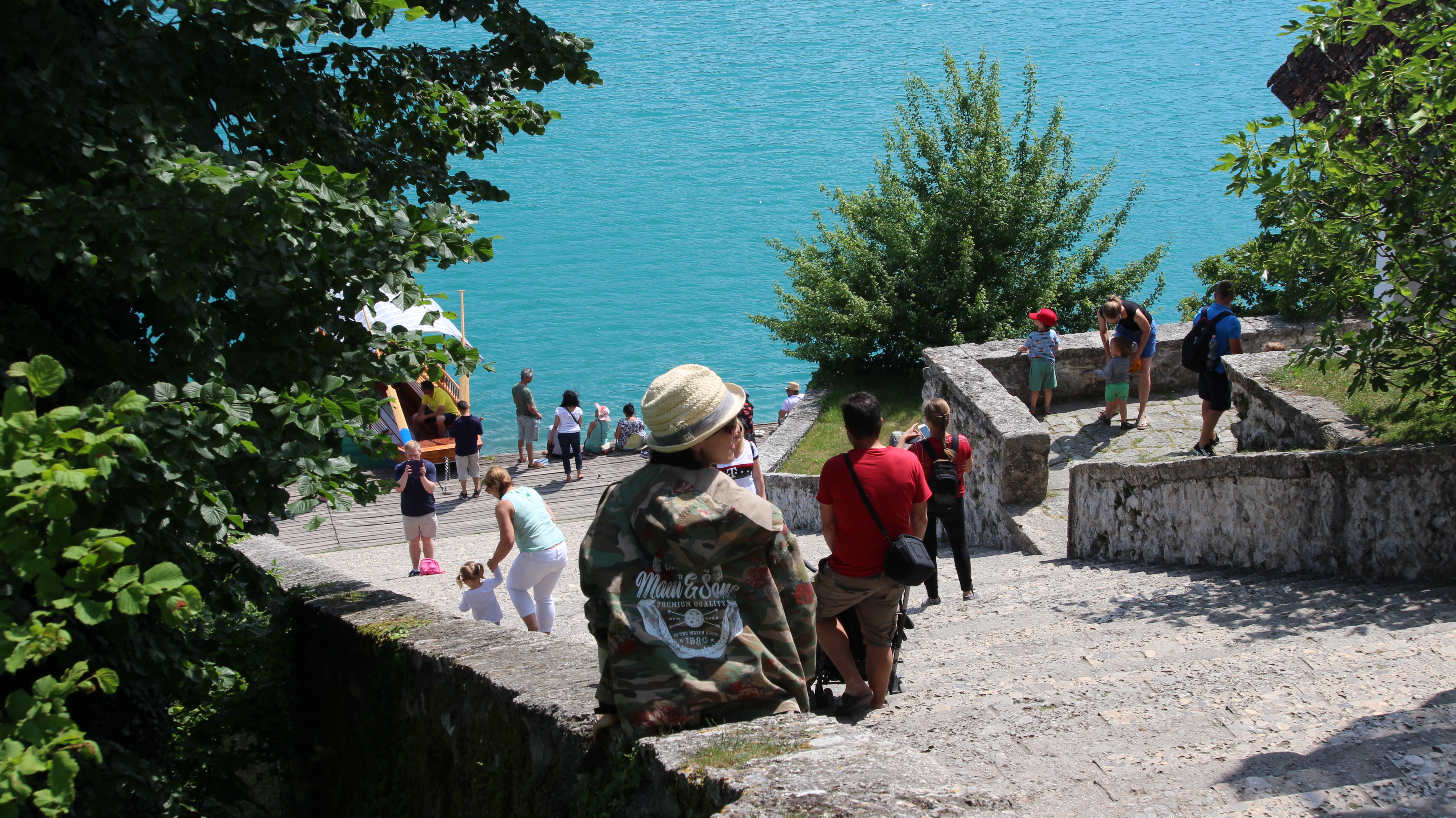 ▲ 호수에서 보니 방금 전 방문했던 블레드 성의 절경이 잘 보입니다. 블레드 호수 북쪽, 103미터 석회암 절벽 꼭대기에 위치해 있기 때문에 천연 요새의 기능을 할 수 있습니다. 하지만 블레드 성에서는 실제 전투가 벌어진 적은 없었고 주로 휴양지로 사용되었다고 합니다.